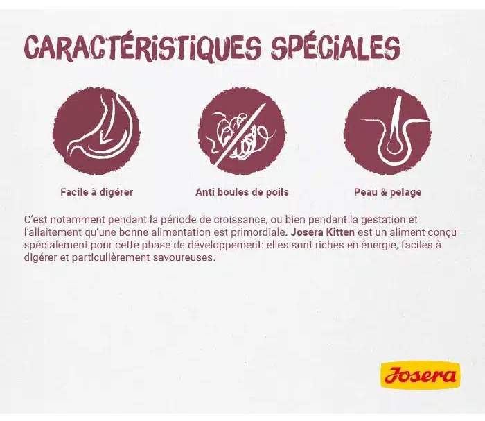 غذای خشک بچه گربه Josera Kitten با طعم مرغ و ماهی، یک رژیم غذایی کامل و متعادل برای بچهگربهها تا سن ۱۲ ماهگی و همچنین گربههای باردار یا شیرده است. در ادامه به بررسی ویژگی های این غذای گربه میپردازیم: