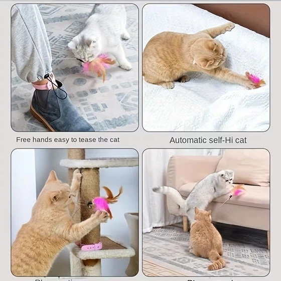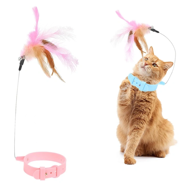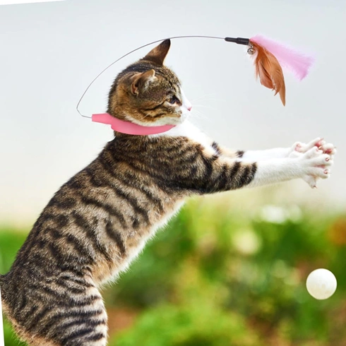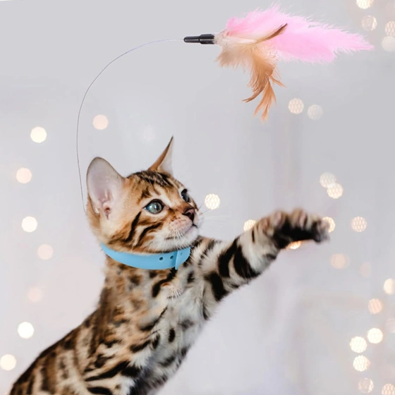 در انتهای این قلاده یک میله تعاملی منعطف قرار دارد که حرکتهای طبیعی و هیجانانگیزی ایجاد میکند.سر این میله، پرهای نرم و جذاب بههمراه یک زنگوله بامزه نصب شده که با کوچکترین حرکت، صدا و جنبوجوش ایجاد میکند و فوراً توجه گربه را به خود جلب میکند در نتیجه چشمهای برقزده، گوشهای تیز و یک گربه آمادهی شکار.