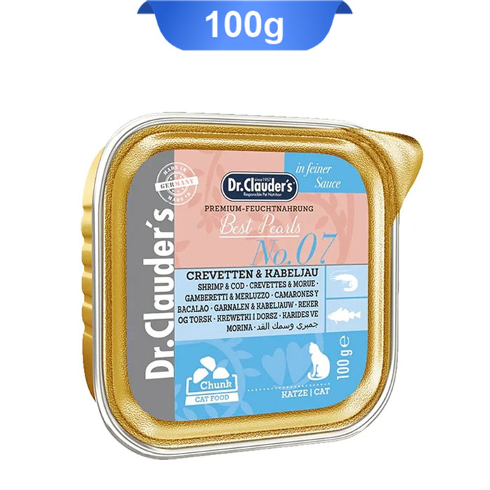 ووم گربه دکتر کلادرز طعم میگو و ماهی کاد مدل چانک در سس وزن 100 گرم Dr.Clauder’s Best Pearls