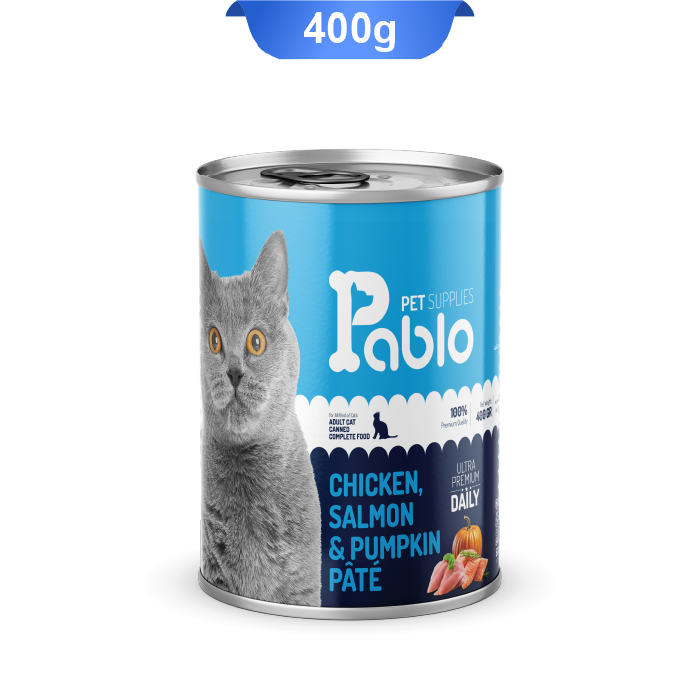 کنسرو گربه بالغ پابلو طعم مرغ و سالمون و کدو تنبل وزن 400 گرم Pablo